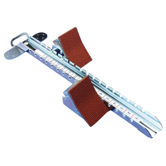 Bloque de inicio de competiciones de acero: bloque de inicio para competiciones de sprint en atletismo. Con la aprobación de la IAAF, la pista de inicio está aprobada para competiciones internacionales al más alto nivel. Diversas posibilidades de ajuste de los bloques de inicio con respecto a las distancias y la inclinación permiten a cada velocista en una posición de inicio óptima. Una escala insertada en la parte media del riel ayuda a establecer la posición correcta. Los bloques cubiertos con tartán ofrecen a las espigas el mejor agarre. El riel central está equipado con puntas para un agarre máximo en pistas de plástico.