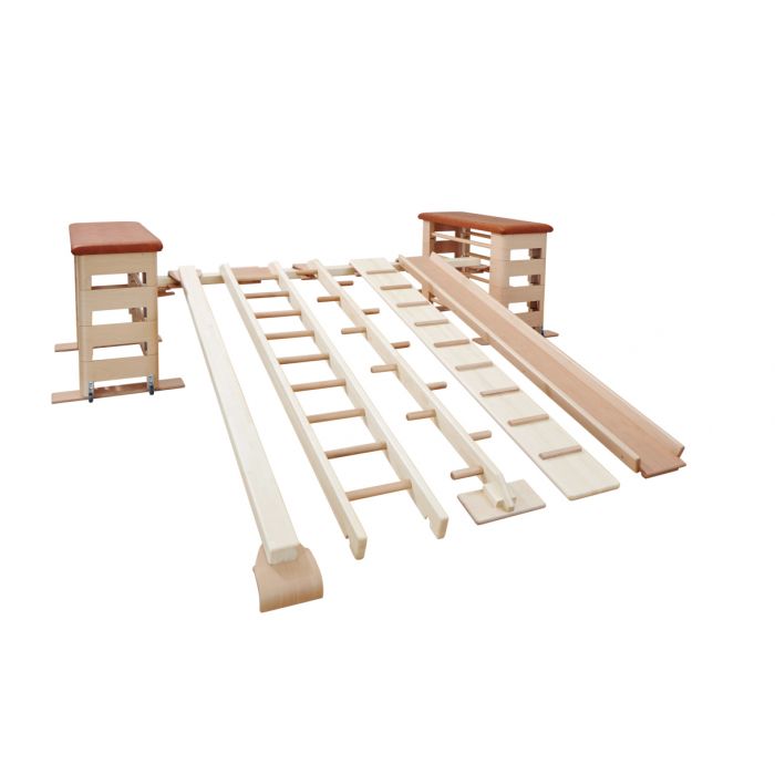 Hecho de madera sólida y resistente, excelente procesado. Con el set obtienes las piezas necesarias para construir espacios de equilibrio y pistas especiales en tu gimnasio.