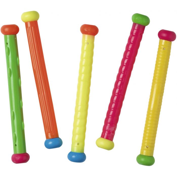 Son posibles numerosas variaciones de juego con los palos de buceo: buceo de slalom, buceo de relevo o recoger tantos palos como sea posible. Debido a los diferentes colores, también puedes bucear por color.