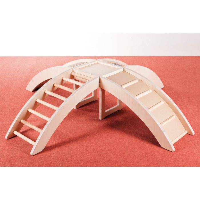 El puente de escalada consta de varios elementos. Camino de red de escalada, escalera de pollo, tabla con barras, escalera de gimnasia. Tamaño posicionado 200 x 200 x 45 cm. Hecho de multiplex con barras de madera dura.