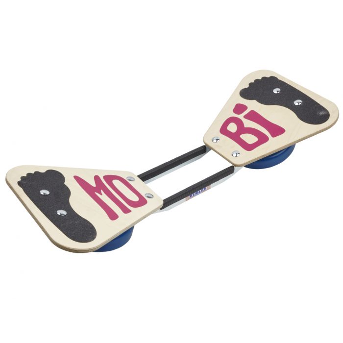 Mobi: un dispositivo de equilibrio diverso para muchas actividades divertidas y deportivas. El balancín es adecuado para la educación física en escuelas y clubes, así como para aplicaciones terapéuticas. Mobi consta de dos tableros de madera contrachapada, que están interconectados por medio de puntales metálicos. Estos descansan sobre dos neumáticos de plástico pivotantes que permiten girar y avanzar. Mobi es para niños de 5 a 12 años.